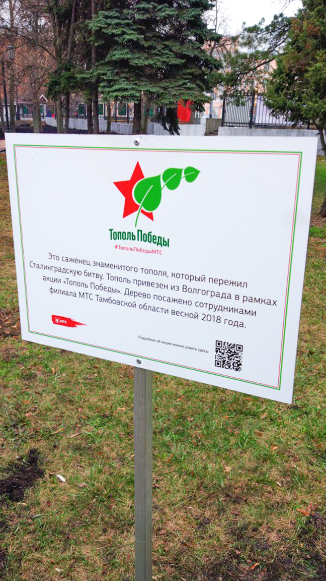 В апреле 2018 года, который, кстати, объявлен Годом добровольца, акция прошла во второй раз, в 15 новых городах. Снова из Волгограда перевозили ценные саженцы в специальных ударопрочных рефрижераторах, поддерживающих особую температуру. Только маршруты были новые: высаживали прибывшие ростки около домов ветеранов, на городских аллеях и в парках Самары, Оренбурга, Саратова, Белгорода, Орла, Воронежа, Липецка, Тамбова, Курска, Калуги, Уфы, Ярославля, Тулы, Калининграда и Ростова-на-Дону. Около каждого дерева по традиции установили табличку с QR-кодом. Он ведёт на интернет-страницу проекта, ту, которую вы читаете сейчас, чтобы каждый прохожий понимал, что перед ним — тот самый тополь.Символ жизниПамять о Великой Отечественной Войне по-прежнему хранят миллионы россиян, однако физических свидетельств тех времен с каждым годом остается все меньше и меньше. Именно поэтому каждая вещь, напоминающая о героических подвигах наших солдат, — реликвия в глазах молодого поколения. Волгоградский тополь стал настоящим символом жизни для россиян, а его саженцы — продолжением великой истории.Информация с сайта http://www.media.mts.ru/topol/