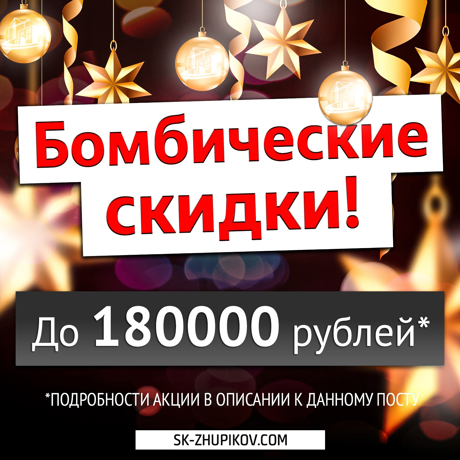 Акция действует с 14.12.2018 по 31.12.2018. Подробности об организаторе акции, и правилах ее проведения, размерах скидок, сроках, месте, порядке их получения по телефону 55-99-53 и у продавцов-консультантов по адресу: Д. Красненькая, Тамбовский район, ул. Совхозная, 210. Срок получения скидок совпадает со сроком проведения акции. Кол-во квартир участвующих в данной акции ограниченно! С проектной документаций объектов участвующих в акции можно ознакомиться на сайте: sk-zhupikov.com Полное наименование застройщика — ООО «Строительная компания Жупиков»