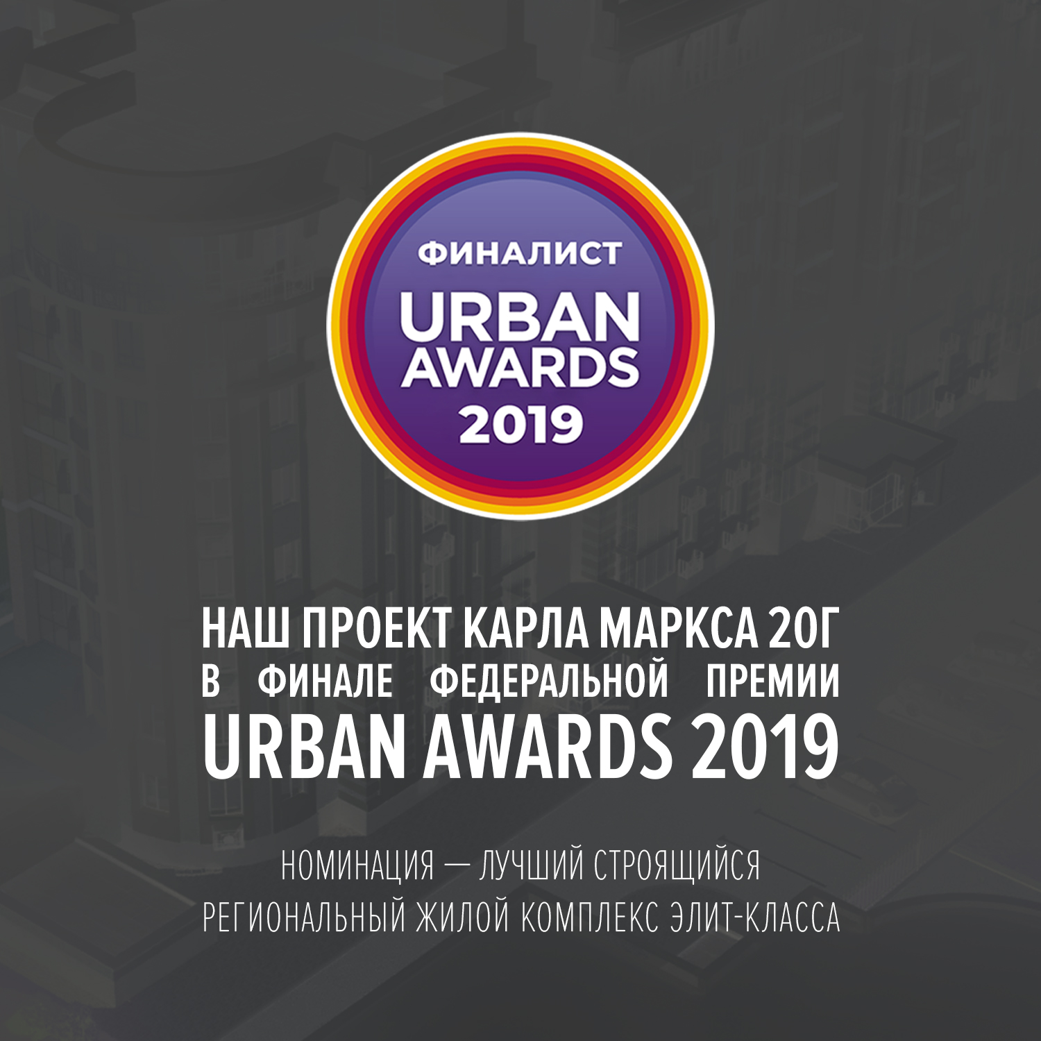Наш проект «Карла Маркса 20г» в финале самой престижной федеральной премии URBAN AWARDS 2019 в номинации «Лучший строящийся региональный жилой комплекс элит-класса». Это первый случай в истории строительного комплекса Тамбовщины.