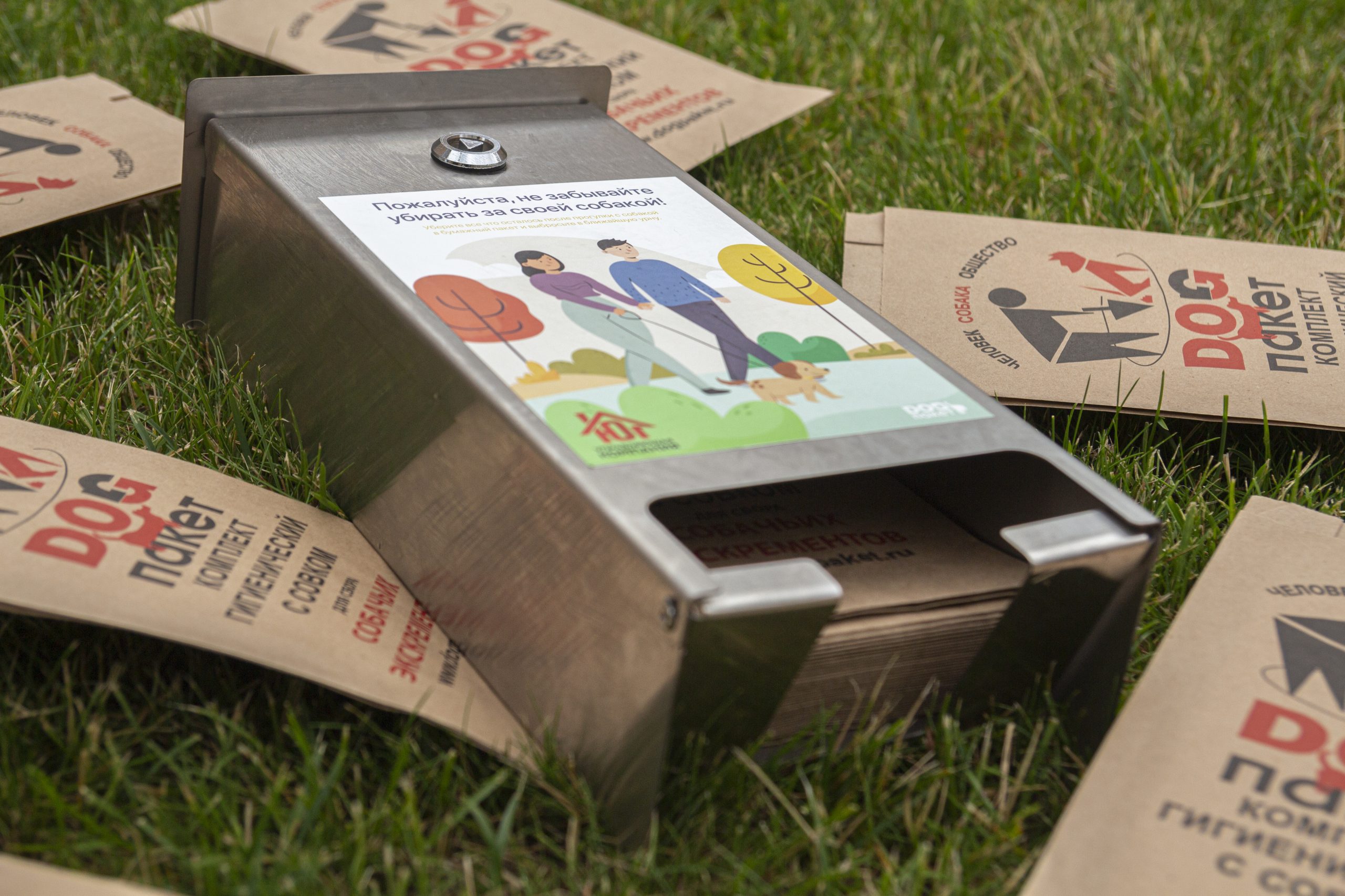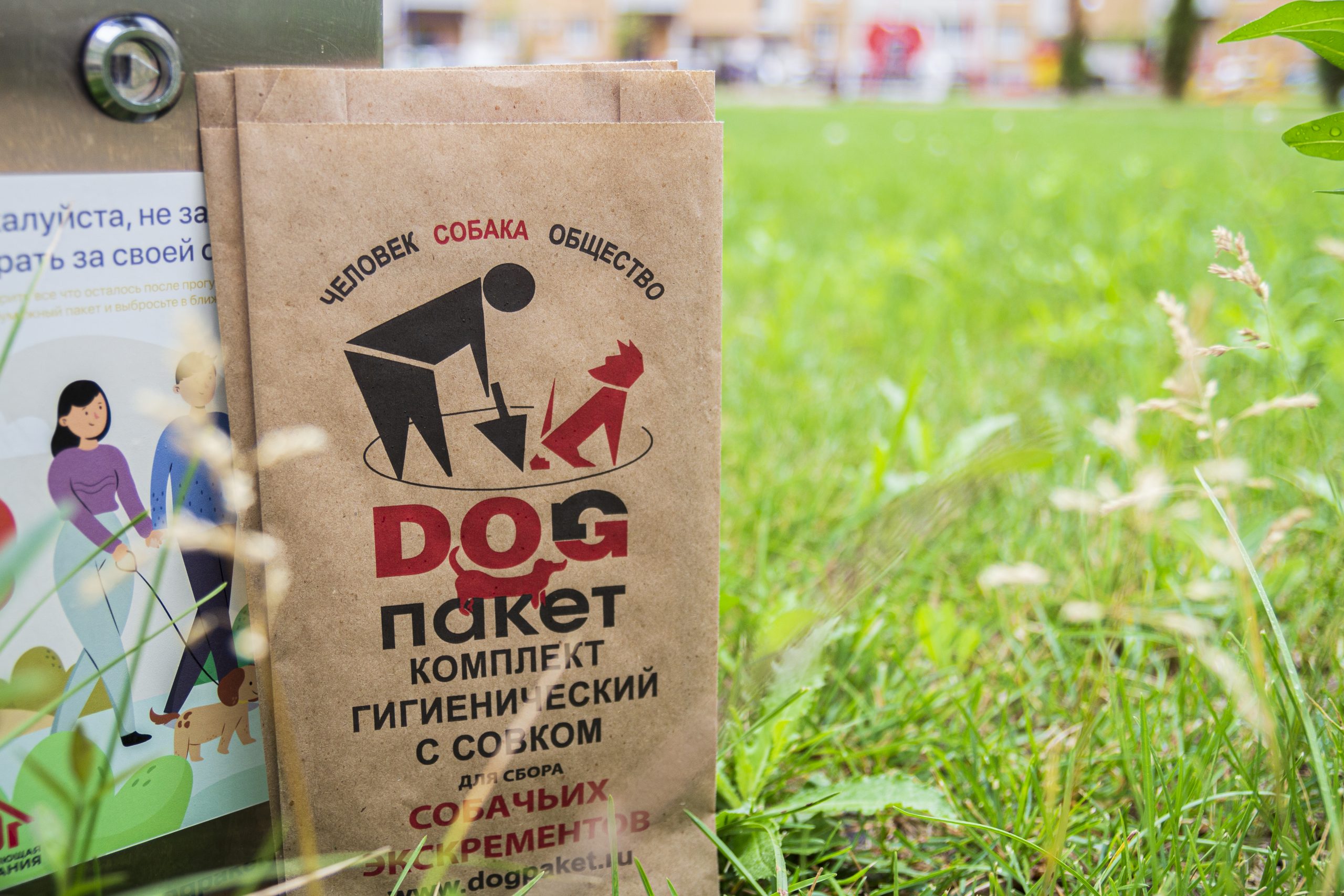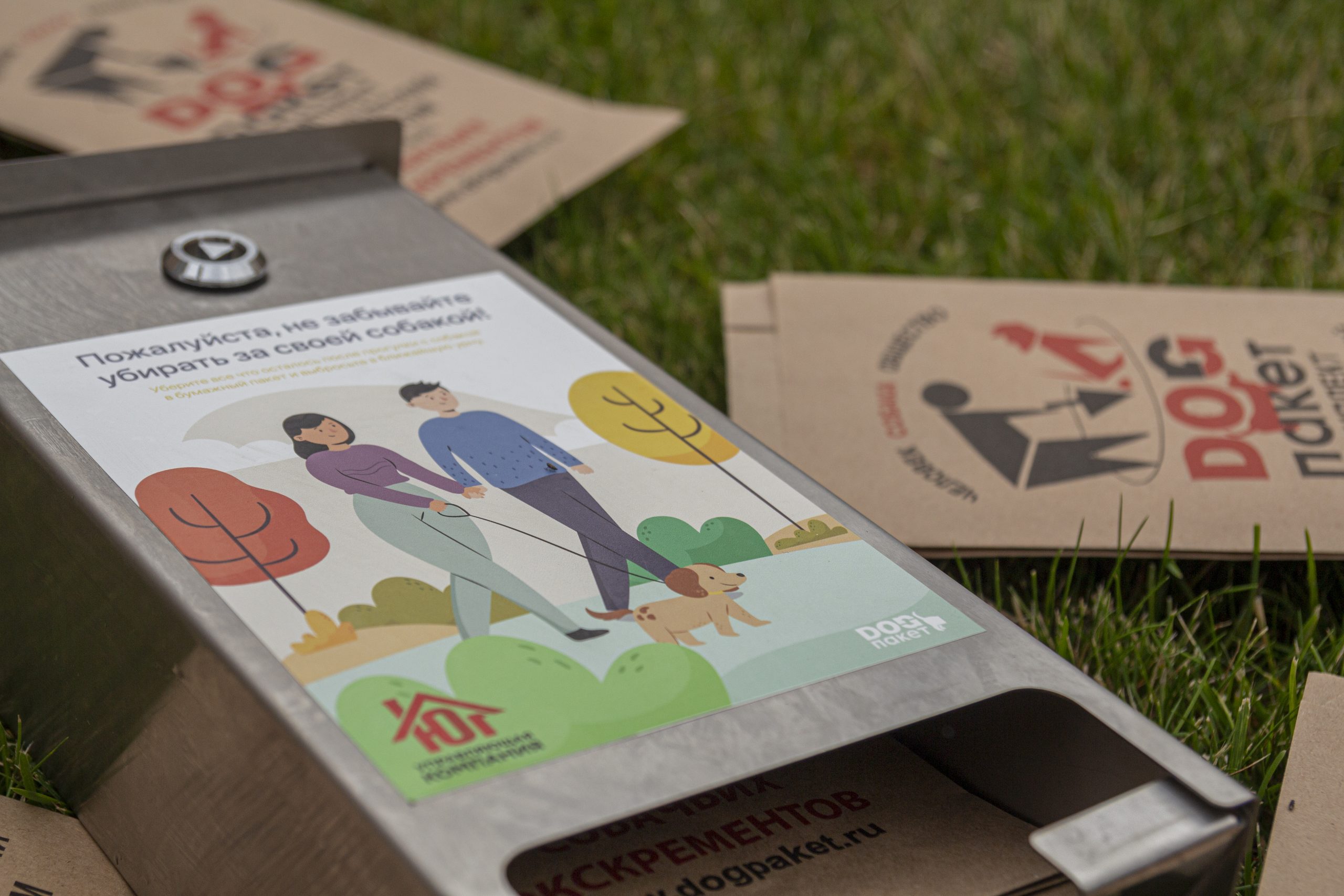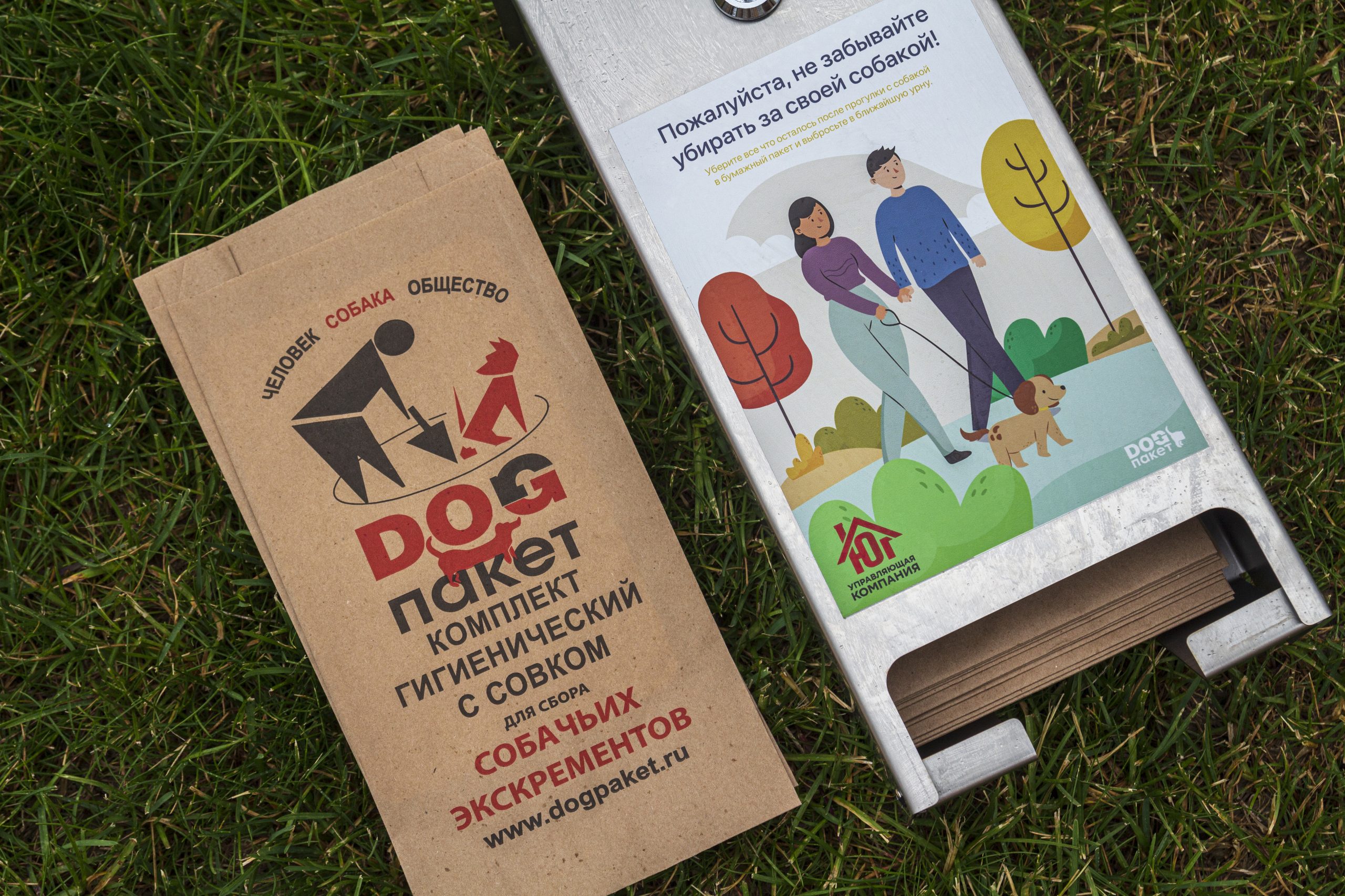 Внутри каждого диспенсера — биоразлагаемые бумажные пакеты для собачьих экскрементов c картонным совком. Мы расположили их вблизи выходов с территории жилого комплекса, около входных групп 4 и 2 корпуса.